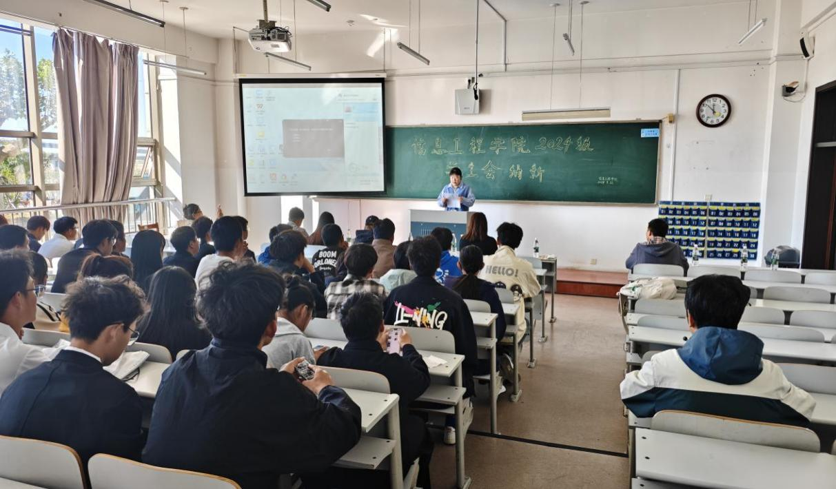 为进一步壮大学院学生组织力量,为学生干部队伍的发展注入新的活力,信息工程学院于2024年9月22在獐子岛教学楼131教室举办团委学生会纳新大会。2024级辅导员艾柳君、2022级主席团、部长团及候选人参加本次大会。大会由高艺菲主持。