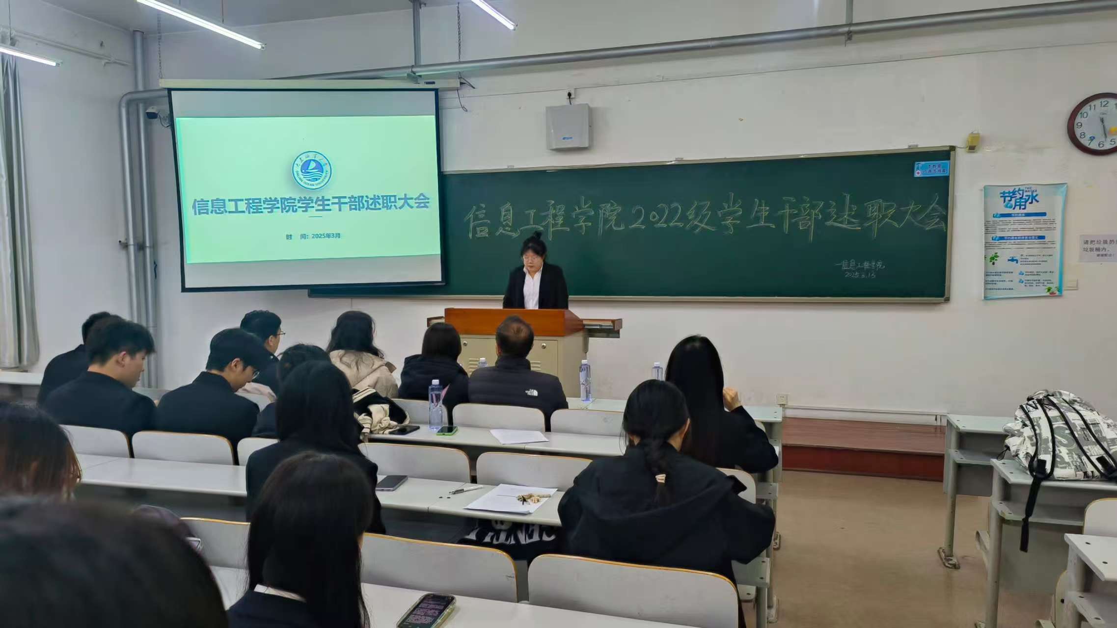 为总结过去一学期的工作成绩与经验,查找不足,明确2025年新的工作方向和思路。信息工程学院于近期在獐子岛教学楼104教室召开学生干部述职大会。信息工程学院党委副书记于洋、团委书记修恒哲、各年级辅导员、全体学生干部参会。会议由高艺菲主持。