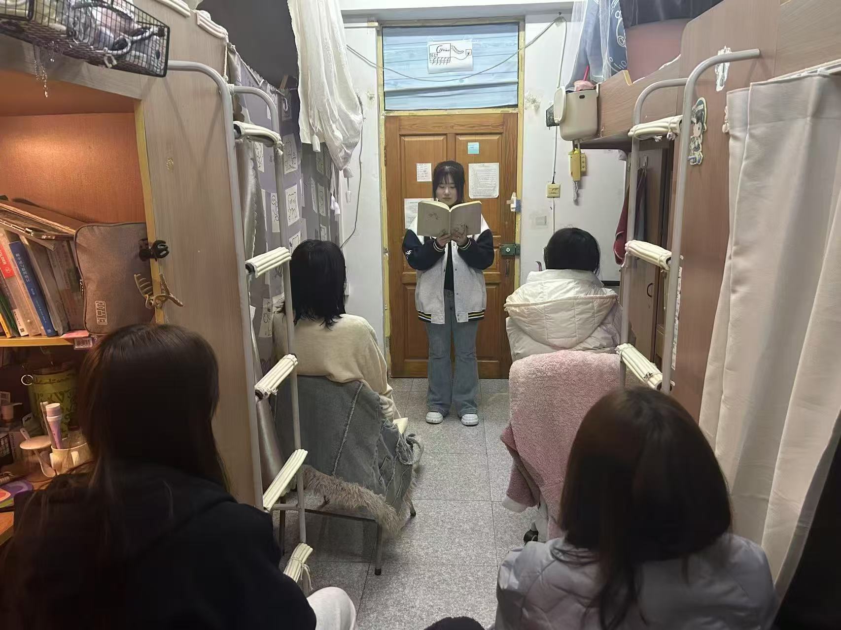 活动中,20余名入党积极分子组成的“红色宣讲团”深入学生宿舍,以寝室为课堂,通过“围坐夜话”的形式,将党的创新理论与书架上的专业典籍、书桌前的学习场景有机融合。宣讲员们用青年视角解读党的理论,让红色故事在同学之间流淌,使党的创新理论在生活场景中具象化呈现。